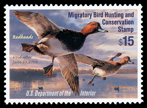 7744 nh RW71A imageFederal Duck Stamp, 2004, $15 Redheads, self-adhesive (Scott RW71A), o.g., never hinged, Extremely Fine.