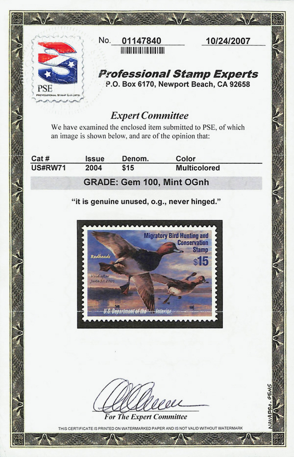 7743 nh RW71 imageFederal Duck Stamp, 2004, $15 Redheads (Scott RW71), o.g., never hinged, Superb, with 2007 P.S.E. certificate graded GEM 100.