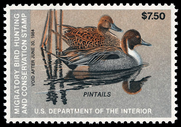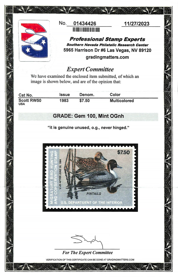 7723 nh RW50 imageFederal Duck Stamp, 1983, $7.50 Pintails (Scott RW50), o.g., never hinged, Superb, with 2023 P.S.E. certificate graded GEM 100.