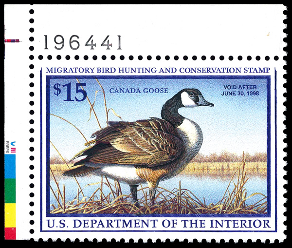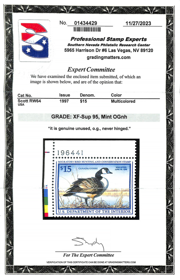 7736 nh RW64 imageFederal Duck Stamp, 1997, $15 Canada Geese (Scott RW64), plate number single, o.g., never hinged, Extremely Fine to Superb, with 2023 P.S.E. certificate graded XF-SUP 95.