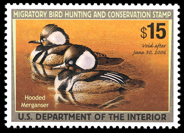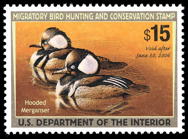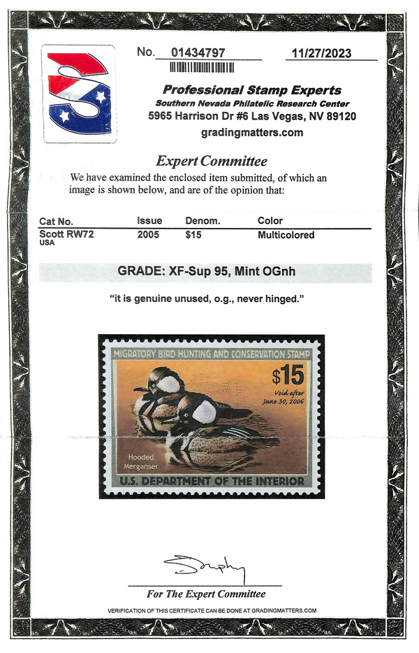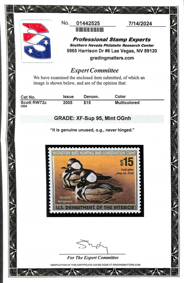 7746 nh RW72c imageFederal Duck Stamp, 2005, $15 Hooded Mergansers, type II (Scott RW72c), o.g., never hinged, Extremely Fine to Superb, with 2024 P.S.E. certificate graded XF-SUP 95.