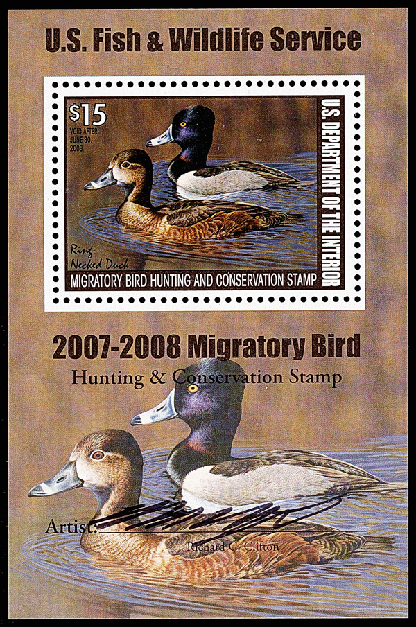 7748 nh RW74b imageFederal Duck Stamp, 2007, $15 Ring-necked Ducks, souvenir sheet of 1 (Scott RW74b), o.g., never hinged, Post Office fresh, Very Fine.