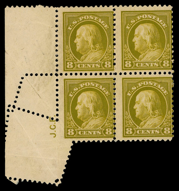 7750 nhbl 508 var. image1917, 8¢ olive bister, perf. 11, pre-perforating fold-over (Scott 508 var.), margin block of 4 with siderographer's initials, fold-over created "crazy perfs"; initials "J.C.F." in selvage; strong lines and color, o.g., never hinged (natural gum creases), Fine to Very Fine. (Image) Suggested Bid $210