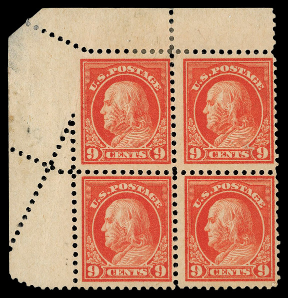 7751 ogbl 509 var. image1917, 9¢ salmon red, perf 11, pre-perforating fold-over (Scott 509 var.), top left corner margin block of 4, fold-over caused "crazy perfs"; bright vibrant color, o.g., hinge remnants (gum disturbance), Fine to Very Fine. (Image) Suggested Bid $130