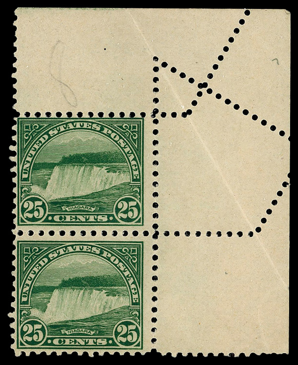 7754 nh 568 var. image1922, 25¢ Niagara Falls, pre-perforating fold-over (Scott 568 var.), top right pair, fold-over created "crazy perfs"; deep color and crisp lines, o.g., never hinged (gum disturbances), Very Fine. (Image) Suggested Bid $78