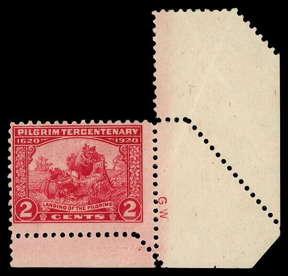 7753 nh 549 var. image1920, 2¢ Pilgrim, pre-perforating fold-over (Scott 549 var.), bottom right single with siderographer's initials, fold-over created "crazy perfs"; stunning graphics and color, o.g., never hinged (natural gum creases), Very Fine.