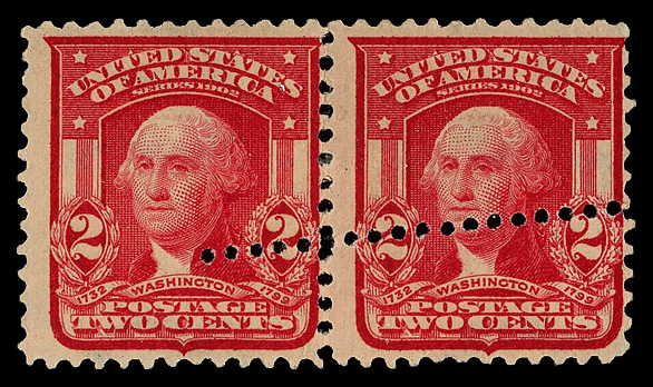 7749 og 319 var. image1903, 2¢ carmine, type I, pre-perforating fold-over (Scott 319 var.), pair, foldover caused "crazy perfs", clean copy with sharp detail with bright color, o.g., lightly hinged or hinge remnant; top 3 vertical perfs separated, Fine to Very Fine. (Image) Suggested Bid $52