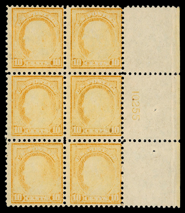 7752 nhbl 510 var. image1917, 10¢ orange yellow, perf. 11, dry printing (Scott 510 var.), right margin plate block of 6, plate number 10255 lightly visible along with the six stamps caused by extreme dry printing; interesting example on bright paper, o.g., never hinged (small spot of gum disturbance), Fine to Very Fine. (Image) Suggested Bid $78