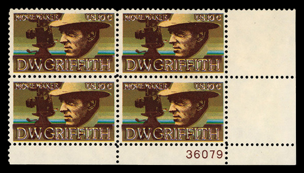 7760 nhbl 1555 var. image1975, 10¢ D. W. Griffith, color shift (Scott 1555 var.), bottom right plate block of 4, "blurred" or "fuzzy" images created by the color shift; plate number 36079, o.g., never hinged, Very Fine to Extremely Fine. (Image) Suggested Bid $26