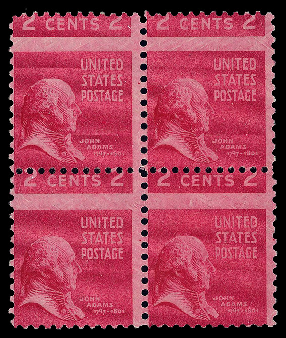 7756 ogbl 806 var. image1938, Presidential Issue, 2¢ John Adams, rose pink, misperforation (Scott 806 var.), block of 4, horizontally misperfed with sharp color and detail, o.g., hinged, Very Fine. (Image) Suggested Bid $30