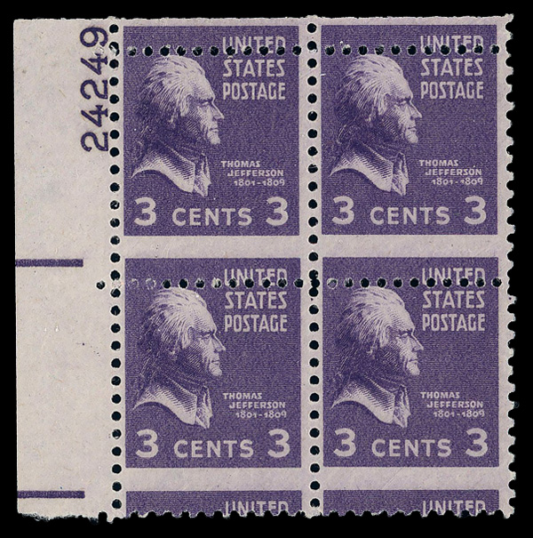 7757 ogbl 807 var. image1938, Presidential Issue, 3¢ Jefferson, misperforation (Scott 807 var.), left margin plate block of 4, clean example with horizontal misperforations throughout; plate number 24249, o.g. (gum disturbances), Very Fine. (Image) Suggested Bid $38