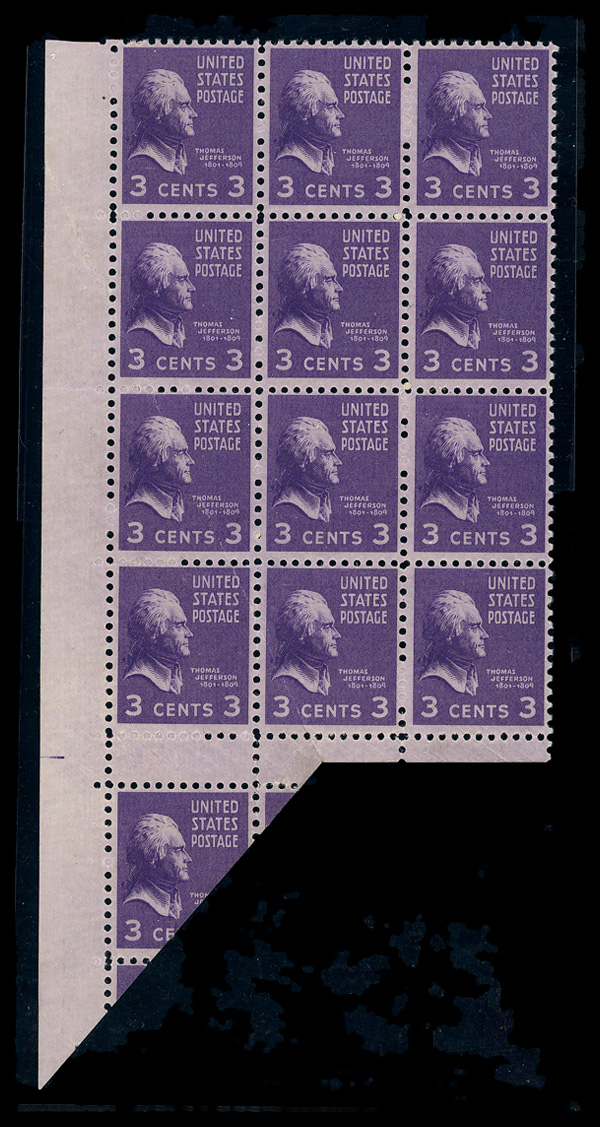 7758 ogbl 807 var. image1938, Presidential Issue, 3¢ Jefferson (Scott 807 var.), left margin block of 13, partial horizontal gutter caused by fold-over and miscut, Very Fine. (Image) Suggested Bid $130