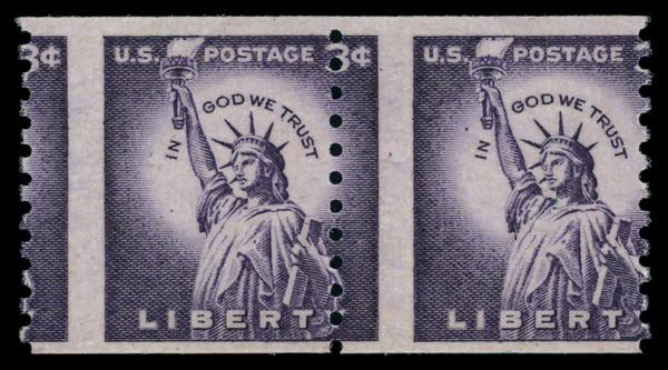7759 nh 1057 var. image1954, Liberty Issue, 3¢ Statue of Liberty, horizontal coil, large perf. holes, wet printing, misperforation (Scott 1057 var.), pair, majestic example with bright color and vertically misperfed through the center, o.g., never hinged, Very Fine. (Image) Suggested Bid $15