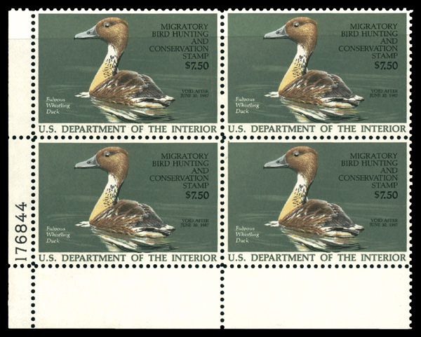 7724 nhbl RW53 imageFederal Duck Stamp, 1986, $7.50 Fulvous Whistling Duck (Scott RW53), plate block of 4, o.g., never hinged, Extremely Fine.