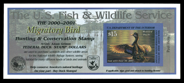 7738 nh RW67A imageFederal Duck Stamp, 2000, $15 Mottled Duck, self-adhesive (Scott RW67A), o.g., never hinged, Extremely Fine.