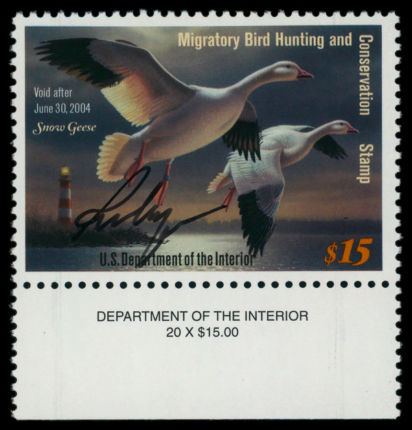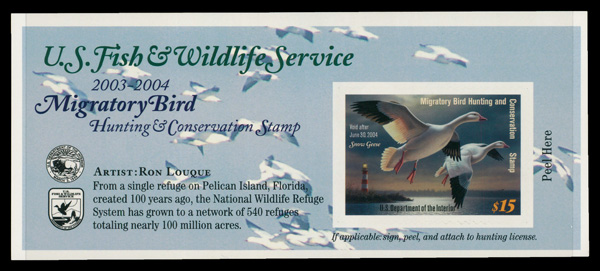7741 nh RW70 imageFederal Duck Stamp, 2003, $15 Snow Geese (Scott RW70), o.g., never hinged, Very Fine to Extremely Fine.