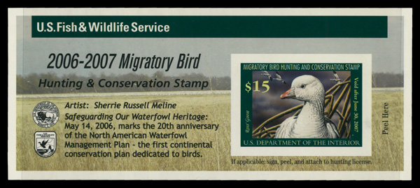 7747 nh RW73A imageFederal Duck Stamp, 2006, $15 Ross's Goose, self-adhesive (Scott RW73A), o.g., never hinged, Extremely Fine.