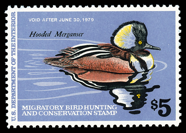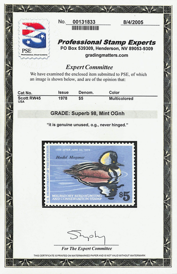 7722 nh RW45 imageFederal Duck Stamp, 1978, $5 Hooded Merganser (Scott RW45), o.g., never hinged, Superb, with 2005 P.S.E. certificate graded SUP 98.