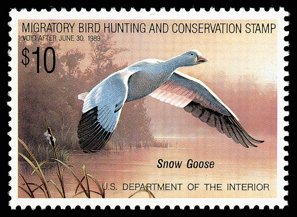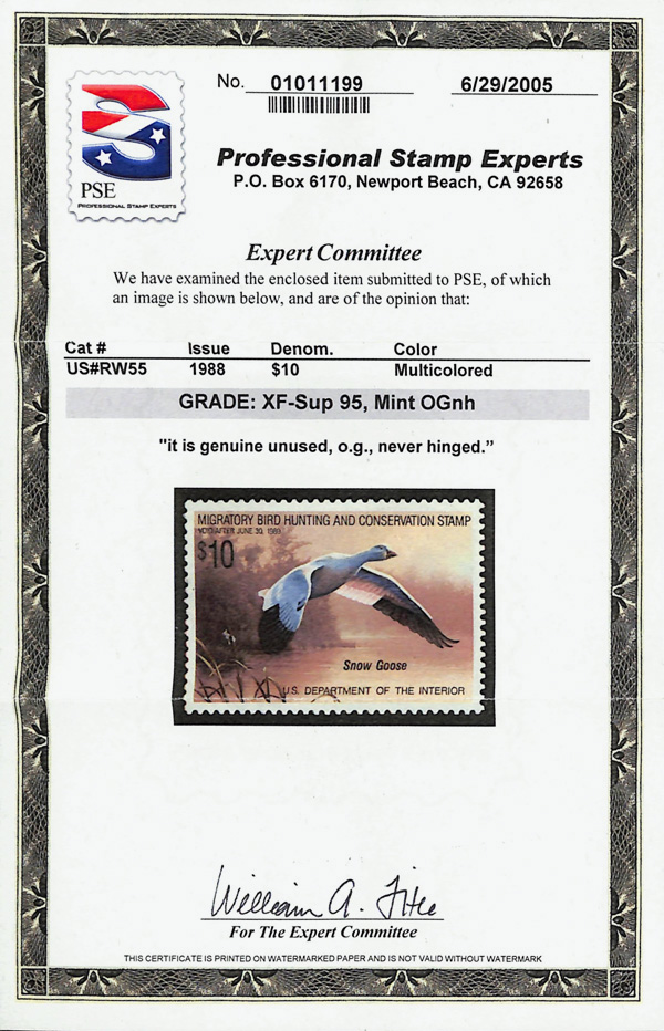 7726 nh RW55 imageFederal Duck Stamp, 1988, $10 Snow Geese (Scott RW55), o.g., never hinged, Extremely Fine to Superb, with 2005 P.S.E. certificate graded XF-SUP 95.