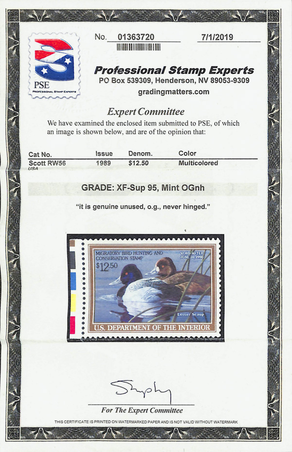 7727 nh RW56 imageFederal Duck Stamp, 1989, $12.50 Lesser Scaup (Scott RW56), o.g., never hinged, Extremely Fine to Superb, with 2019 P.S.E. certificate graded XF-SUP 95.