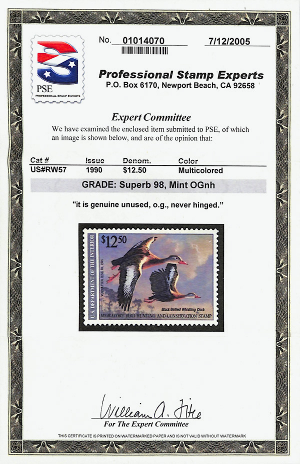 7728 nh RW57 imageFederal Duck Stamp, 1990, $12.50 Whistling Duck (Scott RW57), o.g., never hinged, Superb, with 2005 P.S.E. certificate graded SUP 98.
