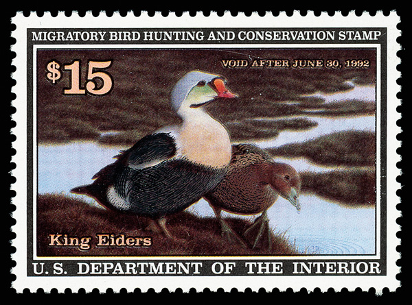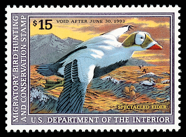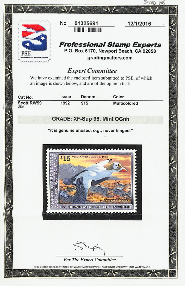 7730 nh RW59 imageFederal Duck Stamp, 1992, $15 Spectacled Eider (Scott RW59), o.g., never hinged, Extremely Fine to Superb, with 2016 P.S.E. certificate graded XF-SUP 95.