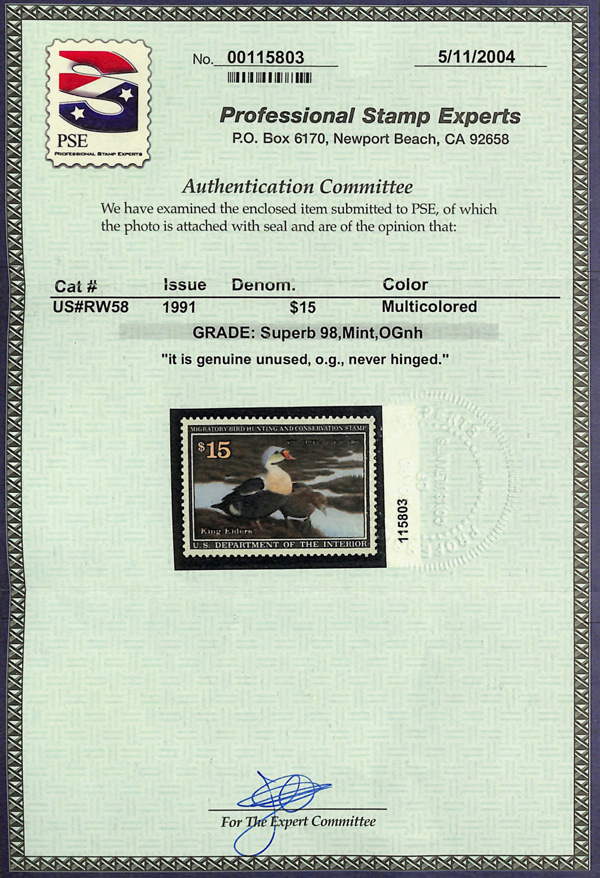 7729 nh RW58 imageFederal Duck Stamp, 1991, $15 King Eiders (Scott RW58), o.g., never hinged, Extremely Fine to Superb, with 2004 P.S.E. certificate graded XF-SUP 95.