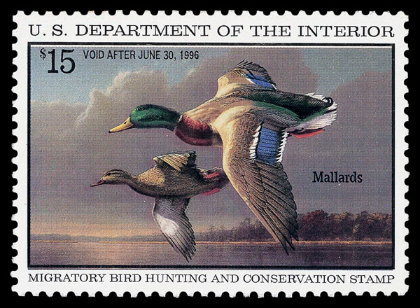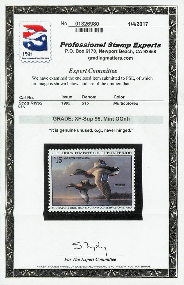 7734 nh RW62 imageFederal Duck Stamp, 1995, $15 Mallards (Scott RW62), o.g., never hinged, Extremely Fine to Superb, with 2017 P.S.E. certificate graded XF-SUP 95.