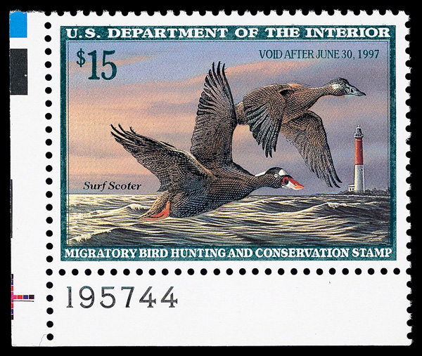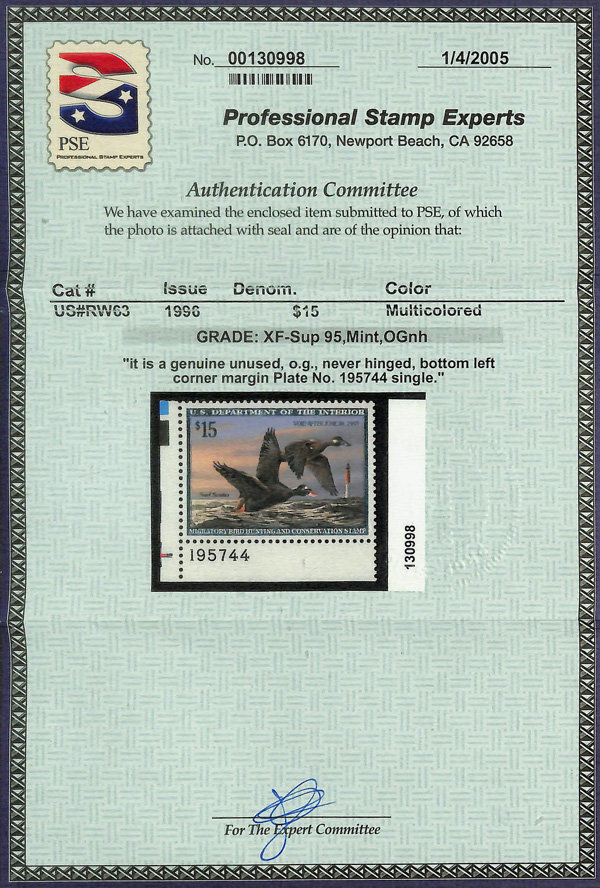 7735 nh RW63 imageFederal Duck Stamp, 1996, $15 Surf Scoters (Scott RW63), plate number single, o.g., never hinged, Extremely Fine to Superb, with 2005 P.S.E. certificate graded XF-SUP 95.