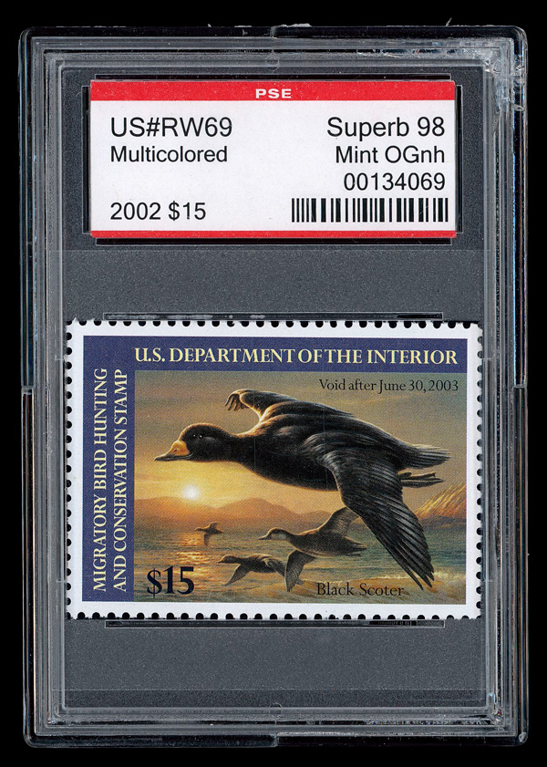 7740 nh RW69 imageFederal Duck Stamp, 2002, $15 Black Scoters (Scott RW69), o.g., never hinged, Superb, with P.S.E. encapsulated certificate graded SUP 98.