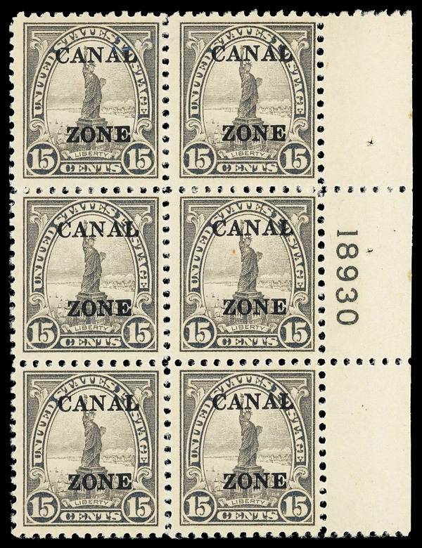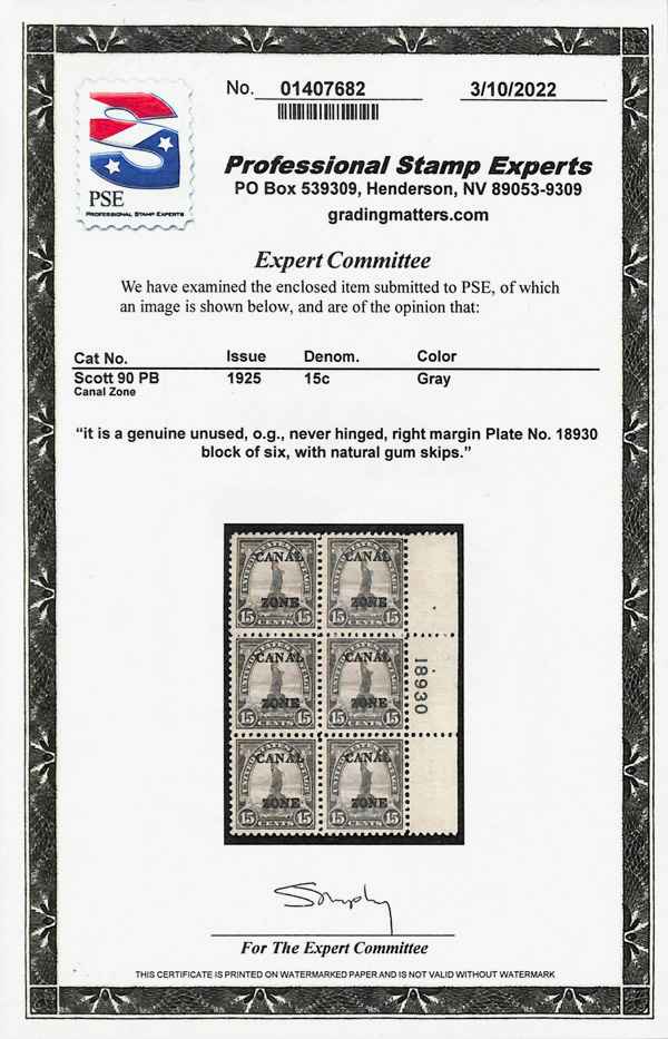 7792 nhbl 90 image1926, 15¢ Statue of Liberty, sharp "A" (Scott 90), plate block of 6, o.g., never hinged (natural gum skips), Fine to Very Fine, with 2022 P.S.E. certificate.