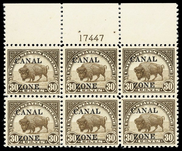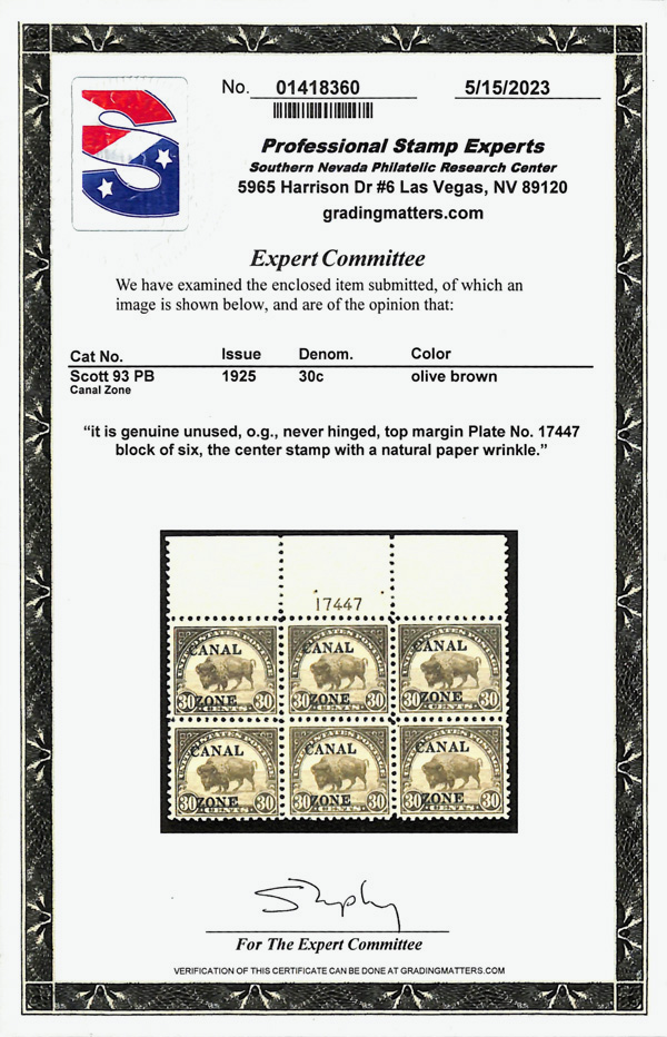7793 nhbl 93 image1926, 30¢ American Buffalo, sharp "A" (Scott 93), plate block of 6, o.g., never hinged (gum crease), Fine to Very Fine, with 2023 P.S.E. certificate.
