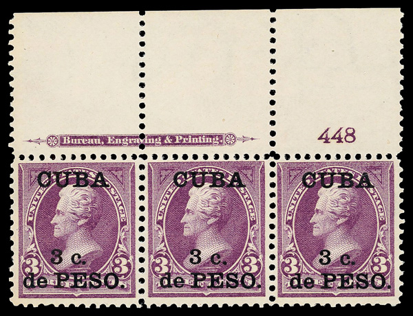 7796 nh 224 image1899, 3c on 3¢ Jackson (Scott 224), imprint and plate number strip of 3, o.g., never hinged (gum crease), Fine, with 2022 P.S.E. certificate.