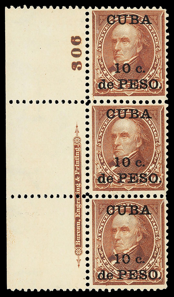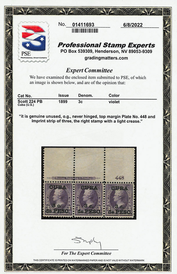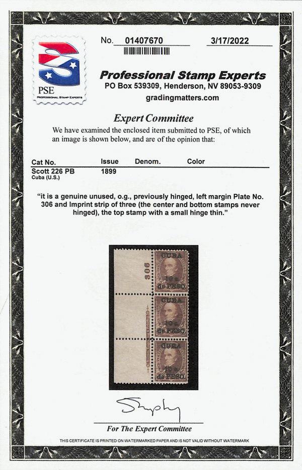 7797 og 226 image1899, 10c on 10¢ Webster, type I (Scott 226), imprint and plate number strip of 3, o.g., lightly hinged; small thin top stamp, Fine to Very Fine, with 2022 P.S.E. certificate.
