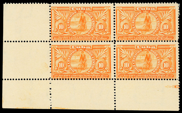 7798 nh/ogbl E3 image1899, 10c orange (Scott E3), corner margin block of 4, o.g., small hinge remnant (3 stamps never hinged), Very Good.