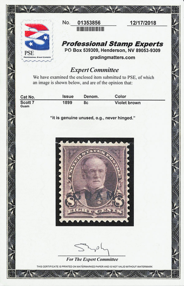 7800 nh 7 image1899, 8¢ Sherman, violet brown (Scott 7), o.g., never hinged, Fine, with 2018 P.S.E. certificate.