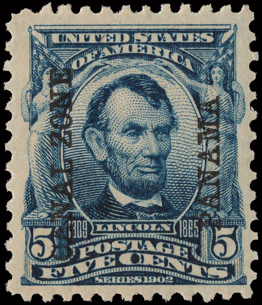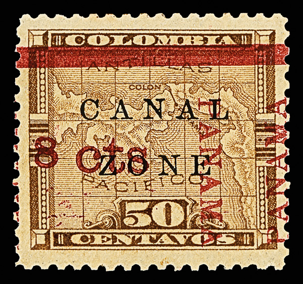 7788 nh 14 var. image1904, 8¢ on 50¢ bister brown, shifted overprint (Scott 14 var.), o.g., never hinged, a pristine example with clean color and superior centering, overprint sharp and strongly shifted to left (both "PANAMA"s at right), Extremely Fine.