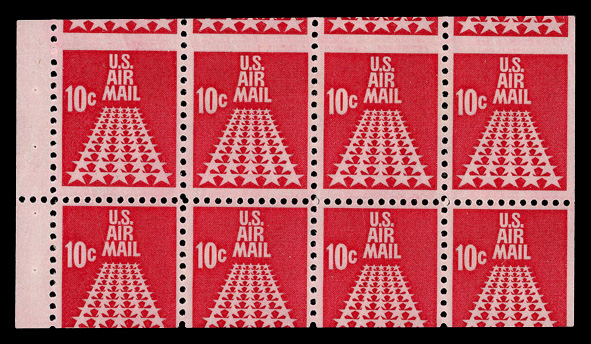7775 BKnh C72b var. imageAirmail, 1968, 10¢ Fifty-Star Runway, booklet pane of 8, miscut (Scott C72b var.), nicely centered example with bold color, o.g., never hinged (natural gum creases), Very Fine to Extremely Fine. (Image) Suggested Bid $10