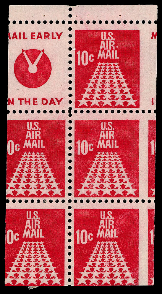 7774 ogbl c72a var. image1968, 10¢ Fifty-Star Runway, booklet pane of 5 with label, miscut (Scott c72a var.), booklet pane of 5 + label, nice color with "mail early in the day" label, disturbed o.g. with thin area on on bottom left stamp, Fine. (Image) Suggested Bid $10