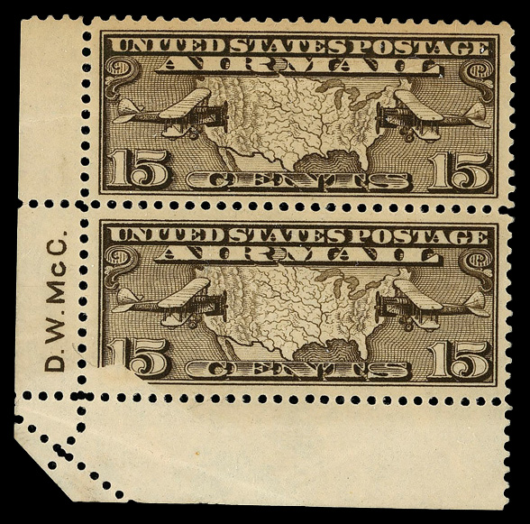 7765 og C8 var. imageAirmail, 1926, 15¢ Map & Planes, pre-perforating fold-over (Scott C8 var.), bottom left pair with siderographer's initials, clean and sound copy; fold-over created "diagonal crazy perfs", initials "D.W. McC."; awesome centering and bold color, o.g., hinge remnant (gum disturbance), Extremely Fine. (Image) Suggested Bid $78