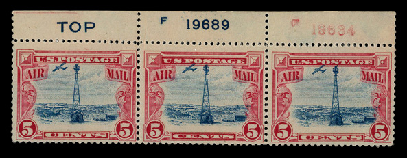 7766 nh C11 var. imageAirmail, 1928, 5¢ Beacon, color shift (Scott C11 var.), top margin plate number strip of 3, plate numbers 19689 and 19634 which is lightly inked; the blue color shift is very apparent above the word cents and the blue plane's wing penetrating the upper frame, o.g., never hinged (gum disturbances), Very Fine to Extremely Fine. (Image) Suggested Bid $105