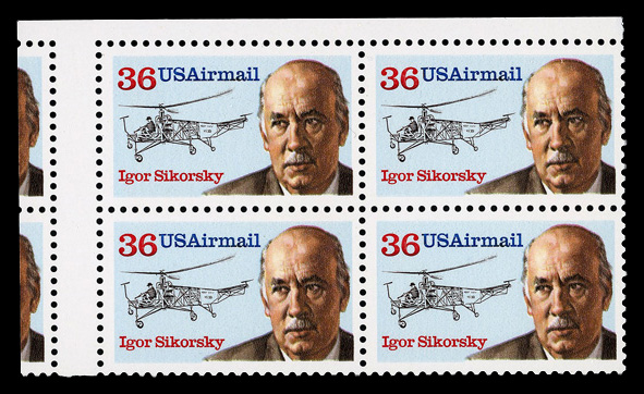 7783 nhbl C119 var. imageAirmail, 1988, 36¢ Sikorsky, miscut (Scott C119 var.), block of 4, gutter snipe at left caused by misregistration of the cutting device or paper fold over, o.g., never hinged, Very Fine to Extremely Fine. (Image) Suggested Bid $38
