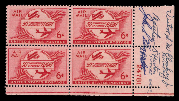 7769 nhbl C47 var. imageAirmail, 1953, 6¢ Powered Flight, engraver's signatures (Scott C47 var.), bottom right plate block of 4, plate number 24781 signed by designer Victor S.W. McCloskey Jr., picture engraver Matthew D. Fenton and lettering John S. Edmondson, o.g., never hinged, Very Fine to Extremely Fine. (Image) Suggested Bid $52