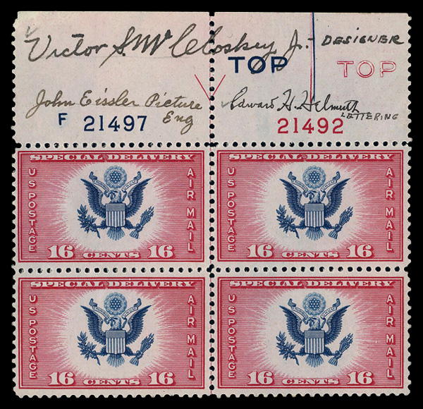 7785 nhbl CE2 var. imageAirmail Special Delivery, 1936, 16¢ red & blue, engraver's signatures (Scott CE2 var.), top margin plate block of 4, beautiful example with plate numbers 21497 and 21492 signed by designer Victor D.W. McCloskeyJr., picture engraver John Eissler and lettering Edward H. Helmuth, o.g., never hinged (natural gum creases), Very Fine to Extremely Fine. (Image) Suggested Bid $105