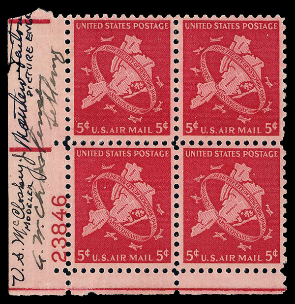 7768 nhbl C38 var. imageAirmail, 1948, 5¢ New York City, engraver's signatures (Scott C38 var.), bottom left plate block of 4, plate number 23846 signed by V.S. McCloskey Jr. modeler, Matthew Fenton picture engraver, A.W. Christianson lettering, o.g., never hinged (natural gum creases), Very Fine to Extremely Fine. (Image) Suggested Bid $52