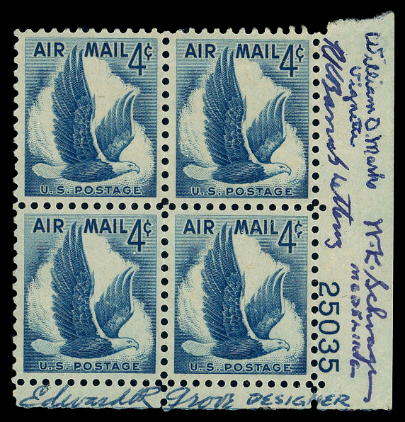 7770 nhbl C48 var. imageAirmail, 1954, 4¢ Eagle, engraver's signatures (Scott C48 var.), bottom right plate block of 4, plate number 25035 with signatures from William D. Marks vignette, W.K. Schrage modeler, R.K. Banek lettering and Edward Grove designer, o.g., never hinged (natural gum creases), Very Fine to Extremely Fine. (Image) Suggested Bid $52