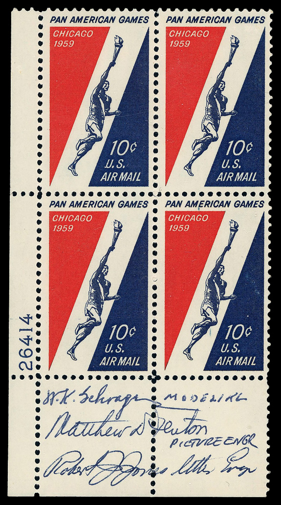 7771 nhbl C56 var. imageAirmail, 1959, 10¢ Pan-American Games, engraver's signatures (Scott C56 var.), bottom left plate block of 4, plate number 36414 signed by modeler W.K. Schrage, picture engraver Matthew D. Fenton,and lettering Robert J. Jones, o.g., never hinged (natural gum creases), Very Fine to Extremely Fine. (Image) Suggested Bid $52