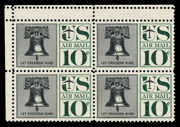 7772 nhbl C57 var. imageAirmail, 1960, 10¢ Liberty Bell, misperforation (Scott C57 var.), block of 4, clean and post office fresh with a full gutter on the top margin, o.g., never hinged, Extremely Fine. (Image) Suggested Bid $38