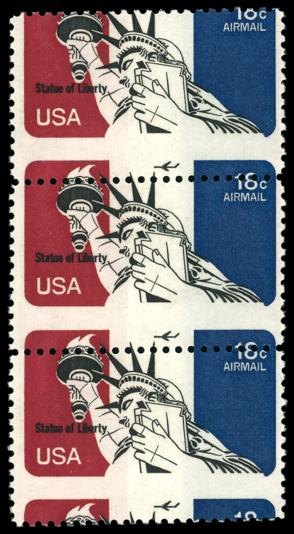 7781 nh C87 var. imageAirmail, 1974, 18¢ Statue of Liberty, misperforation (Scott C87 var.), strip of 3, incredible colors and visuals with horizontal misperforations, o.g., never hinged, Very Fine. (Image) Suggested Bid $38
