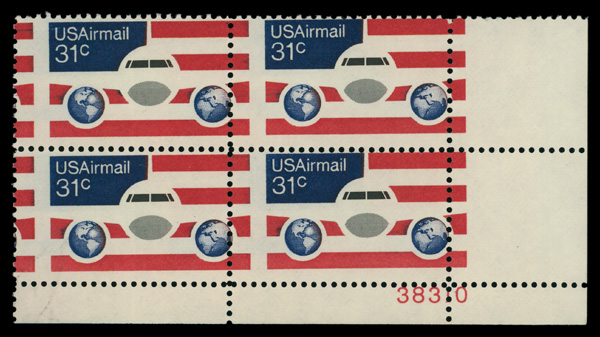 7782 nhbl C90 var. imageAirmail, 1976, 31¢ Plane & Globes, misperforation (Scott C90 var.), bottom right plate block of 4, post office fresh and clean plate number 38310 with perfs shifted to the left, o.g., never hinged, Very Fine. (Image) Suggested Bid $52